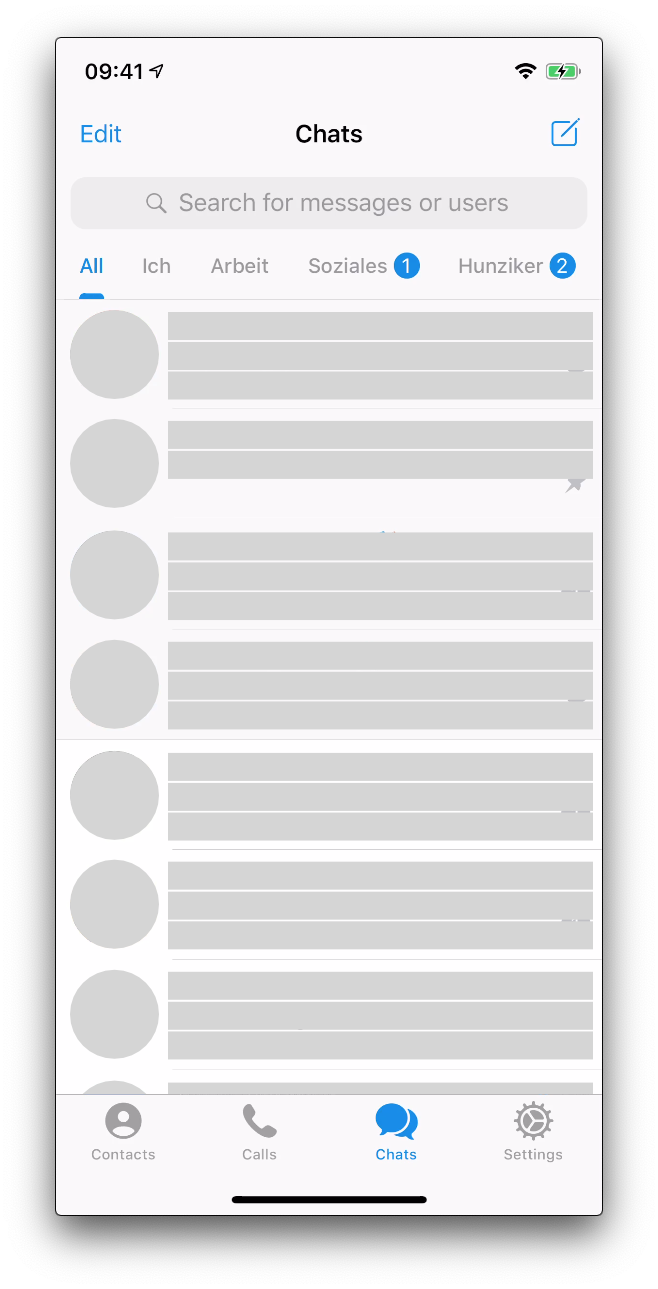 Zusätzliche zu den globalen Einstellungen können pro Chat, egal ob mit Einzelpersonen, Gruppen oder in Kanälen, spezifische Einstellungen gewählt werden. Diese übersteuern dann die globalen Einstellungen. Dazu öffnet ihr zuerst den entsprechenden Chat.